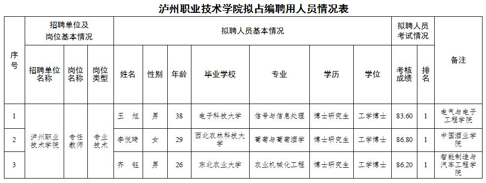 泸州职业技术学院关于拟占编聘用王旭等3名同志的公示